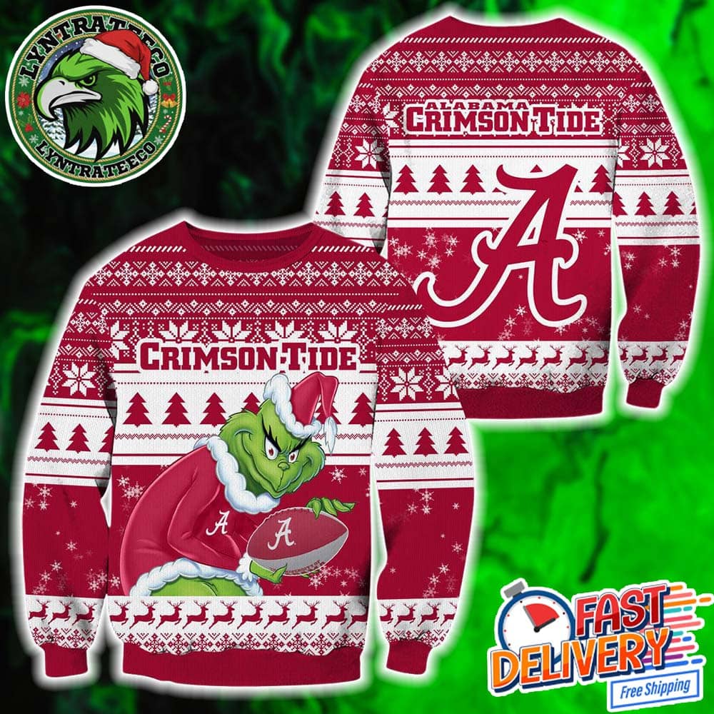 About Alabama Crimson Tide NCAA x Grinch Football 2025 Knitted Ugly Christmas Sweater: