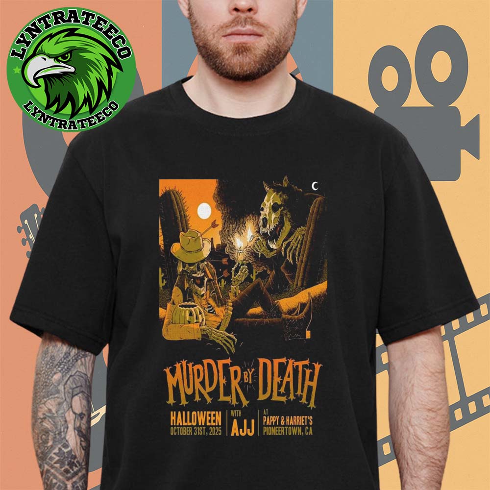 Celebrate a night of haunting melodies and powerful live energy with the Murder By Death With AJJ At Pappy And Harriet’s In Pioneertown CA On October 31, 2025 Unisex T-Shirt. This exclusive concert tee commemorates a legendary Halloween performance under the desert sky, where Murder By Death’s cinematic rock meets AJJ’s raw, emotional punk sound. Made from soft, premium-quality cotton, this shirt offers lasting comfort, breathability, and durability—perfect for concerts, festivals, or everyday wear. The striking design showcases the event’s date and location, making it a must-have for fans who want to remember this unforgettable Halloween night.