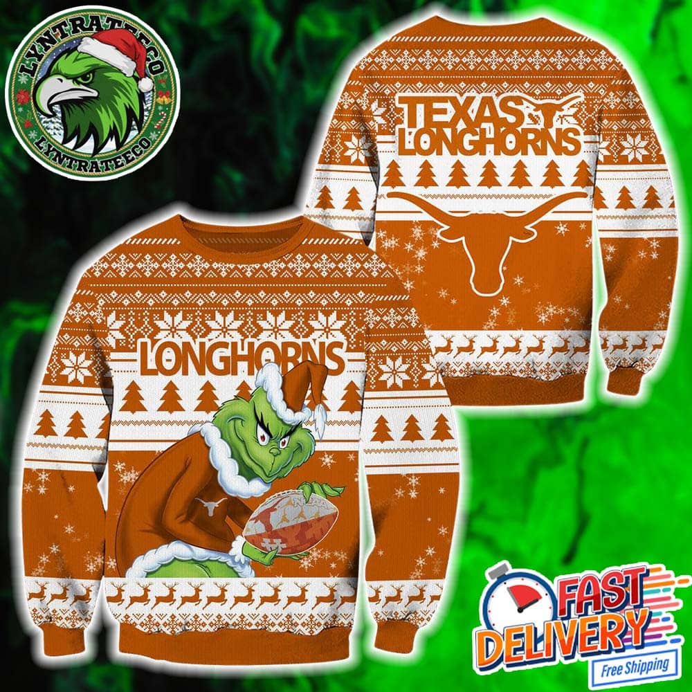 About NCAA Texas Longhorns x Grinch Football Personalized Christmas 2025 Holiday Ugly Christmas Sweater: